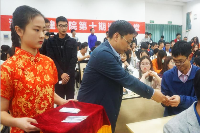 本期道德讲堂共分为“省吾身,唱歌曲,诵经典,学模范,谈感悟,齐宣誓,送吉祥”七个环节。省吾身环节,开场主持人提出三个问题“在生活中我们是否有拖延的习惯?在学习中我们有没有敷衍了事?在工作中我们是否做到了尽职尽责?”唱歌曲环节,伴随着悠扬的歌声,全体人员在心中默默反省自己。在诵经典环节,一首慷慨激昂的《少年中国说》令全体师生体会到了奋发图强的家国情怀和使命感。学模范环节,周俊范结合自身成长经历,与大家分享了如何从一个“盲、忙、茫”的颓废青年蜕变为平顶山市道德模范的奋斗故事,向大家讲述了自律自强对成长成才的重要性。谈感悟环节,材料与化工学院党总支书记焦学然发表了题为《重自强必须首先重自律》的讲话,鼓励广大师生不忘初心,爱岗敬业,严以律己方能有所成就。此后,优秀老师代表李山鹰老师、学生代表殷商航分别结合自身经历从不同角度讲述了对自律自强的感悟。宣誓环节,全体师生庄严宣誓,并在“牢记使命,自律自强”的横幅上郑重签名。送吉祥环节,由周俊范和焦学然为我院师生送出本期道德讲堂纪念书签,此次道德讲堂活动圆满结束。