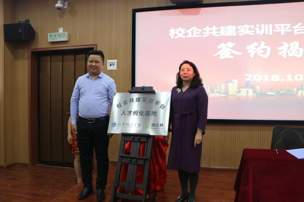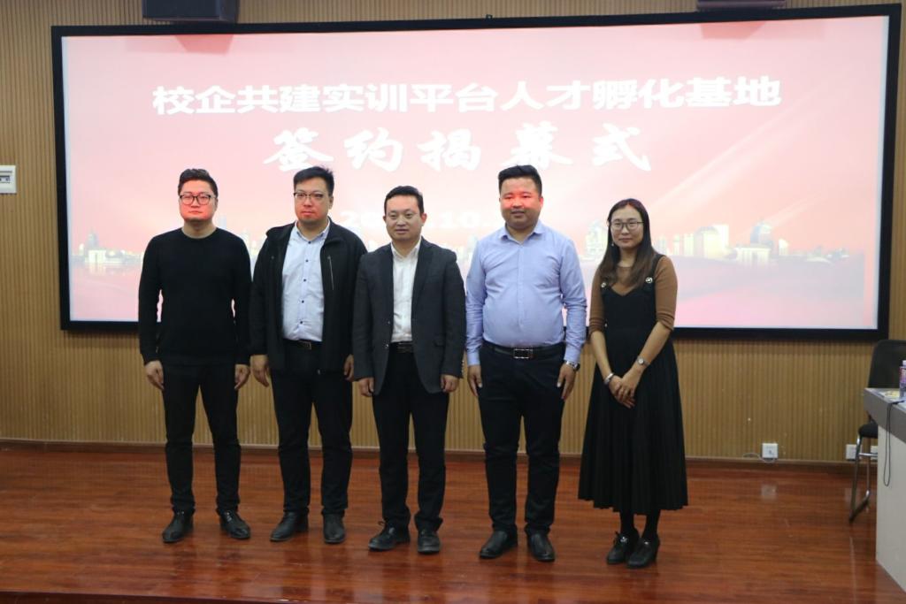 邢燕与郭平通共同为校企共建实训平台人才孵化基地签约剪彩。