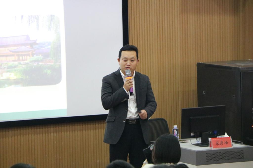 宋彦峰重点介绍了园林专业的发展与前景,通过多个典型案例强调要根据当地历史文化做设计,在河道修复工程与河流区域综合治理中应把握城市与河流的关系,打造“会呼吸的河流”。最后,宋彦峰向全体师生展示大学生职业规划内容。
