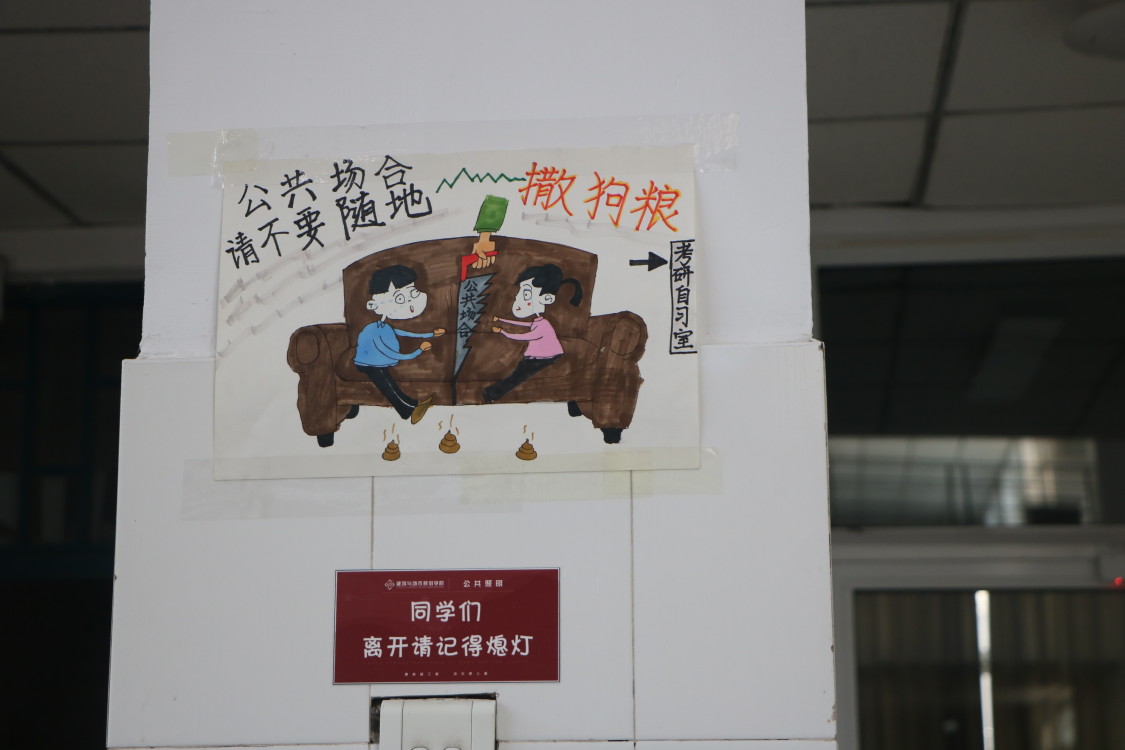 此次活动于建筑与城市规划学院大厅开始,青年志愿者协会成员分多路在教学楼多处粘贴优秀的绘画作品宣讲文明,一幅幅简单明了的作品无不在提醒着我们要讲文明树新风,在公共场合注意自己的言行举止。