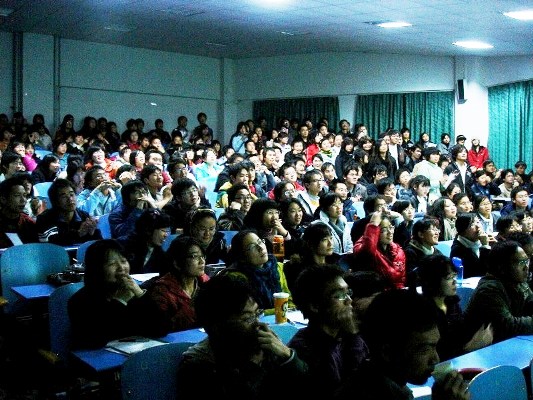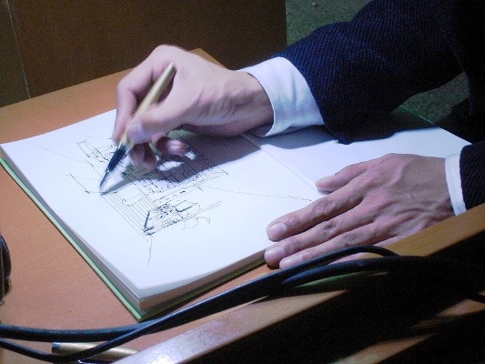 七点开始的讲座在六点三十分已经座无虚席,而且走廊也挤满了学生。讲座紧紧围绕“建筑前景、设计思想、建筑绘画”等几个主题。丁选老师首先讲了他对建筑画技法的理解,同时还向大家讲述了大学时代学习设计的过程,并且介绍了许多优秀作品。然后两位老师热情的回答了同学们的提问。
