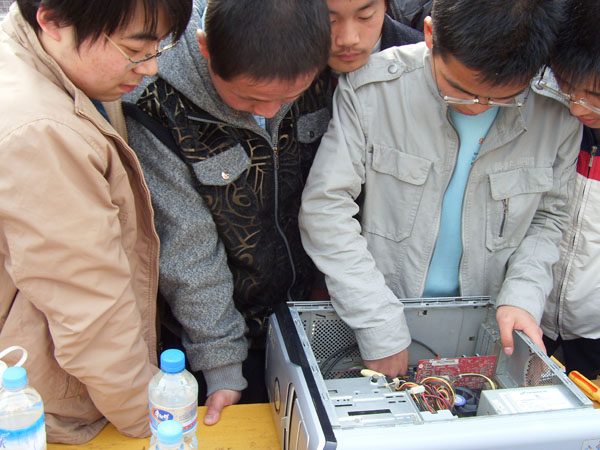 3月16日下午在福美来超市门前活动拉开序幕,整个活动历时三个半小时,活动现场许多同学闻讯带着问题前来咨询,问题包括:计算机硬件、装机操作、系统重装、局域网组建等方面。计算机系的同学都给以耐心而详细的解答,他们甚至深入宿舍帮助解决问题。附近工地上的师傅们闻讯,也带着电脑而来,计算机系同学经过认真排查,找出故障所在,给予解决。许多同学对此次活动表示支持,并在学习雷锋的签名版上满怀激情的签下自己的名字。