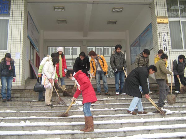 昨天夜里突降大雪,今天整个校园已是白茫茫的一片,道路上积淀了厚厚的一层雪,由于校园里坡路多,雪融化后结冰导致师生们行路不便。为了方便老师和同学们的出行,我系学生干部自发组织这次义务劳动.同学们不顾严寒,拿着铁楸、扫帚将2号系管楼前台阶和道路上的积雪进行清理,又用硬纸板铺在道路上。经过将近两个小时的奋战,系管楼前的积雪被全部清理干净。