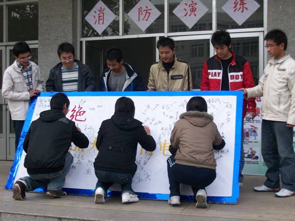 演习结束后,同学们自觉在“杜绝使用大功率电器”的宣传版面上签名,他们纷纷表示,通过这次演习,对火灾的防范和自救有了更深的认识,消防安全意识进一步增强,同时,也进一步体会到了学校对学生的呵护,对生命的尊重。