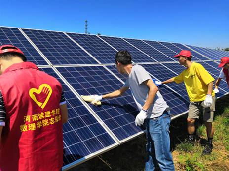(图为师生们一起在电站做太阳能电池板的除尘维护工作)