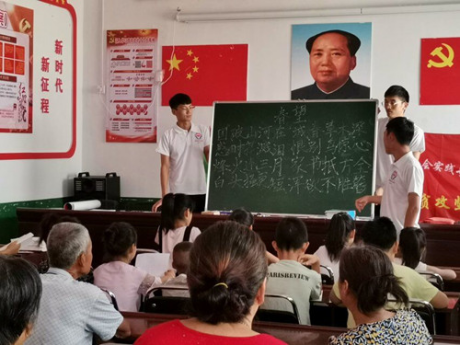 (通讯员 赵许培 徐东亮)为深入贯彻落实习近平新时代中国特色社会主义思想和党的十九大精神,切实推动推普脱贫攻坚,引导贫困落后地区的群众讲好普通话,8月14日至20日,数理学院暑期社会实践服务队的志愿者们在数理学院科研与校企合作办主任赵许培老师的带领下来到鲁山县库区乡搬走岭村开展了为期一周的“推普脱贫”活动,服务队采用走访调研、普通话宣传、诗文诵读、推普小游戏等方式助力贫困山区推普脱贫攻坚。