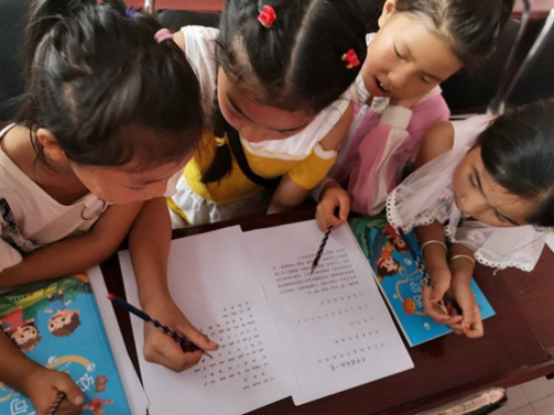孩子是语言的传承者,是普通话扎根山区的希望。在普通话宣讲课堂上,志愿者们带领小朋友们一起学习了《普通话1000句》、《幼儿普通话365句》等推普书籍,他们中的很多人分不清前鼻音和后鼻音、平舌音和翘舌音等基本发音技巧,志愿者们就从最基础的拼音发音教起,不厌其烦、耐心细致。随后志愿者们又从中国优秀文学作品中精选了《沁园春—雪》《少年中国说》《春望》等十几篇优秀作品为孩子们精心讲解,并逐字逐句教大家背会练熟。为了活跃课堂氛围,让孩子们快乐学习,志愿者们在课间休息时还为小朋友们精心准备了“添一笔组新字”、“注音调”、“绕口令”等语言文字类的小游戏。通过开展游戏,在潜移默化中训练了孩子们的普通话发音和规范字书写。