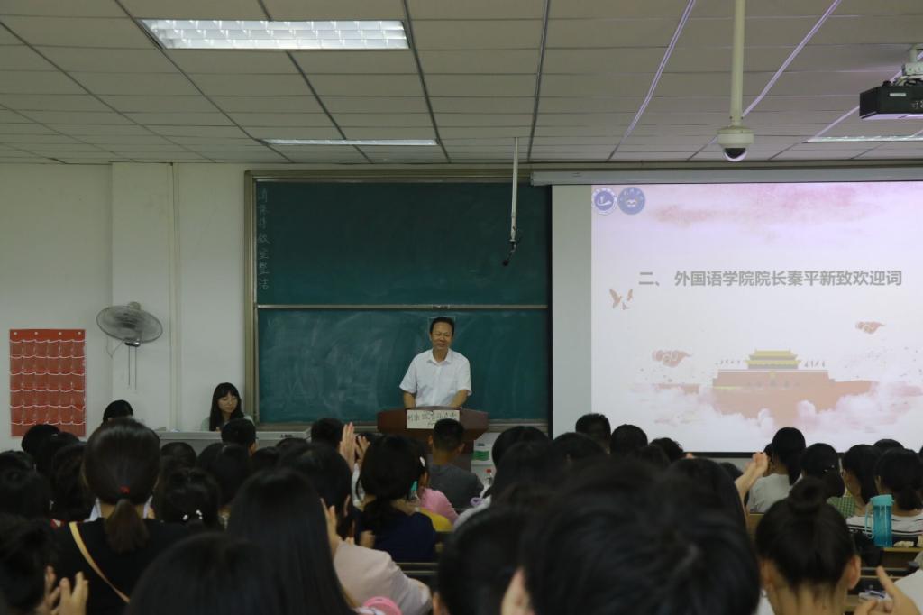 入学典礼在庄严肃穆的国歌声中拉开序幕,开启大一新生思政教育第一课。首先秦平新致欢迎词,他介绍了学院的同传实验室、计算机辅助翻译实验室、语音实验室等硬件设施,英语和翻译两个专业教研室,三个公共外语教研室,学院历年势头良好的考研和就业形势。最后他从“做人能让人感动,做事能让人怀念,心态要谦虚、乐观、宽容”三个方面寄语大一全体新生,祝愿他们的理想在外语铸就,梦想在外语起飞。