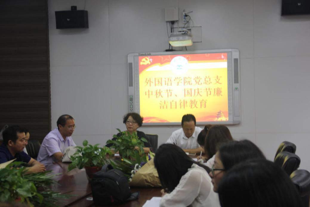 (通讯员 赵星辰)2019年中秋节、国庆节即将来临之际,为教育和引导广大党员干部把纪律和规矩挺在前面,营造崇廉尚俭的节日氛围,外国语学院党总支在一号楼306会议室召开2019年中秋节国庆节期间廉洁自律教育会议,院党总支书记袁晓、院长秦平新、副书记张换成、副院长秦小锋和院全体党员参加会议。会议由张换成主持。