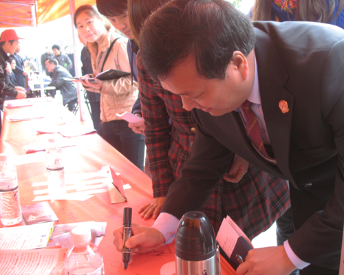 (通讯员 张强)今年的12月4日是国家第10个法制宣传日,根据中宣部、司法部、全国普法办关于开展2010年“12•4”全国法制宣传日系列宣传活动的通知精神,在院领导的关怀与大力支持下,12月4日上午,法律系主任王艳芳教授带领百余名师生,在鹰城广场开展了以“弘扬法治精神,促进社会和谐”为主题的普法宣传暨“做知法守法好公民”万人签名仪式活动;与此同时,法律系另一部分师生在校园内开展的普法宣传活动也有声有色、红红火火地同步进行。