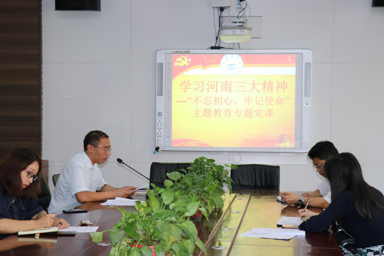 (通讯员 赵星辰)根据中央“不忘初心、牢记使命”主题教育领导小组印发《关于开展第二批“不忘初心、牢记使命”主题教育的指导意见》和我校“不忘初心、牢记使命”主题教育工作提示。9月24日下午,外国语学院党总支在1号教学楼306会议室开展专题党课,院党总支副书记张换成、副院长秦小锋、教工第一党支部书记、学生第一、第二党支部书记参加党课,全体师生党员共同聆听了党课。为学习贯彻落实习近平视察河南重要讲话精神,专题党课内容为:学习焦裕禄精神、红旗渠精神、大别山精神三大红色精神。张换成负责讲专题党课。
