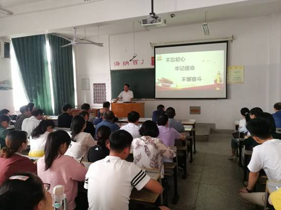 杨留栓重点围绕“我们党的初心和使命是什么”“为什么要不忘初心牢记使命”“怎样才能不忘初心牢记使命”和“牢记初心,立足岗位作贡献”等四个方面,通过引经据典和大量的历史资料阐述了党的初心和使命以及结合工作实际坚守初心的重大意义。杨留栓指出,作为党员,要持之以恒提升党性修养,补思想之“钙”,固党性之“元”,铸党性之“魂”,做一名合格党员;作为教师,要努力成为有理想信念、有道德情操、有扎实学识、有仁爱之心的“四有”好老师;作为学生,要树立正确的人生观、价值观和世界观,努力学好专业知识,争做思想道德品质高尚的新时代青年。