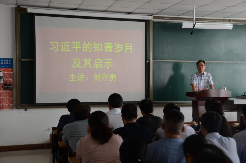刘守勇以“习近平的知青岁月及其启示”为主题,和大家分享了自己在“不忘初心、牢记使命”主题教育中的学习体会。课上,刘守勇讲述了习近平在陕西梁家河七年艰苦的上山下乡生活,在这七年里,习近平用他的每一滴汗水和每一份付出,生动诠释了他说的那句话:“干在实处,走在前列。”在这七年里,他扎根黄土地,于实处用力,用青春书写了无愧于时代、无愧于历史的华彩篇章,真实地再现了习近平真实的知青岁月和成长历程。刘守勇结合本次主题教育强调指出:一是不论身处任何环境都要有所追求,勤以修身,不甘平庸;二是将个人追求与民族追求相结合,不忘初心,以身许国;三是学习时代楷模,发扬斗争精神、使命精神,团结一心,积极贡献,同时作为老师要把培养合格的社会主义接班人作为己任。