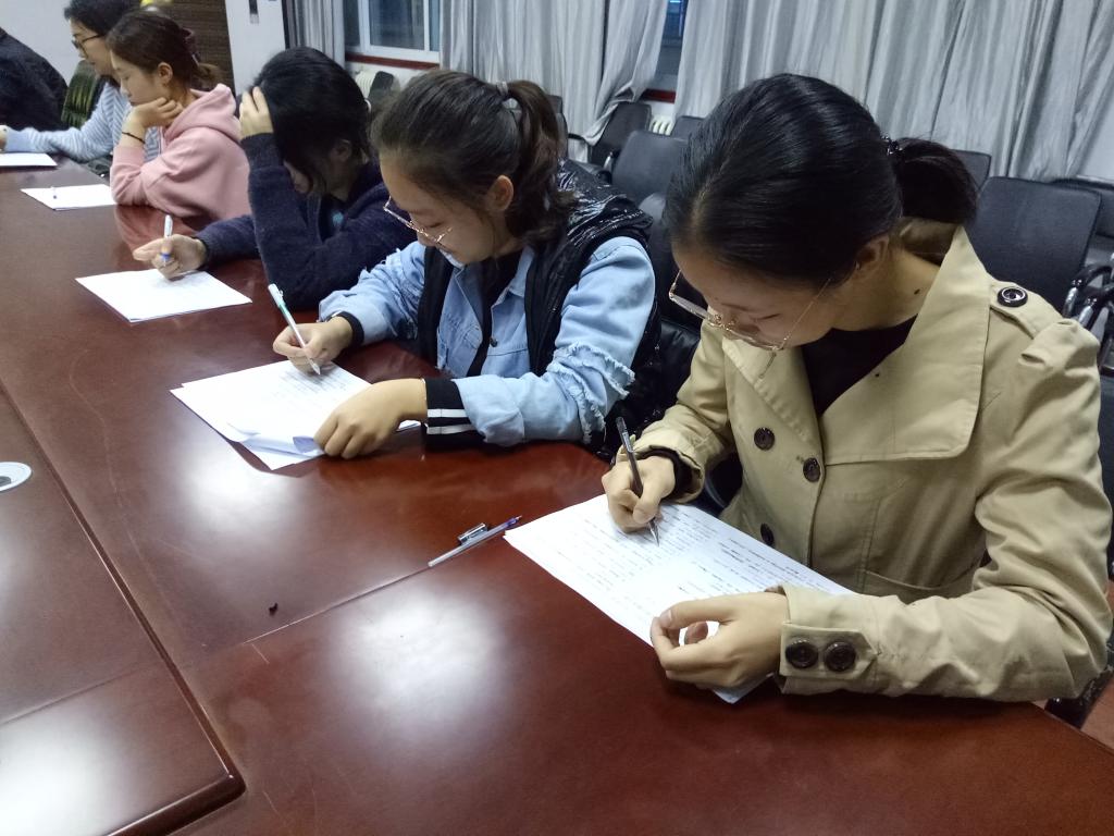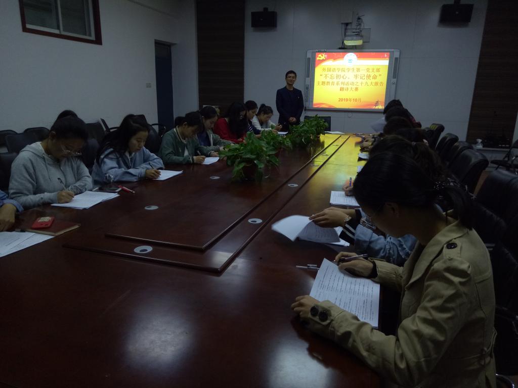 (通讯员 赵星辰)根据学校“不忘初心、牢记使命”主题教育工作安排和学院工作部署,结合外语专业特色和学科优势,10月11日下午外国语学院学生第一党支部在1号楼306会议室举行“不忘初心、牢记使命”主题教育系列活动之十九大报告翻译大赛,第一党支部全体学生党员参加比赛,赵星辰担任监考老师。