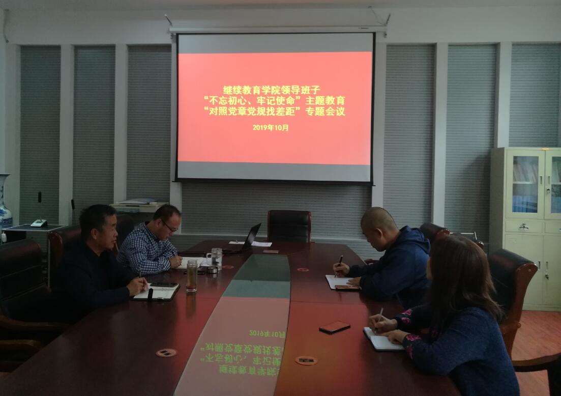 根据主题教育和学校党委要求,10月16日,继续继续教育学院领导班子召开“不忘初心、牢记使命”主题教育“对照党章党规找差距”专题会议,继续教育学院支委会成员参加会议。会议由党支部书记、院长马宁奇主持。