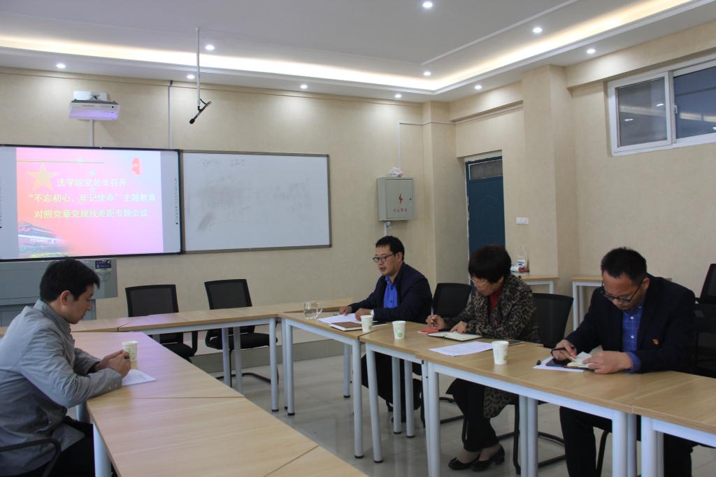 (通讯员 汤继华)10月18日上午,法学院召开“不忘初心、牢记使命”主题教育领导班子对照党章党规找差距专题会议。校第八巡回指导组成员弓亚超和全体班子成员参加,会议由党总支书记尹振羽主持。