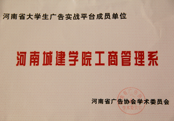 河南省大学生广告实战平台由河南省广告协会学术委员会主办,大河报﹑郑州日报等多家媒体和企业协办。首批会员单位共有24家,我院工商管理系是其中之一。实战平台的目标是探索教育创新,推进教学改革,创造新型人才培养模式,形成有效的人才输出机制,整体提高河南省广告教育水平,促进广告事业发展。