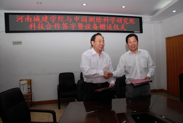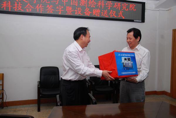 (通讯员 卫柳艳)4月27日下午,我校和中国测绘科学研究院校研科技合作协议签订和设备资料赠送仪式在第一会议室举行,这标志着我校成为国家“863”科技重点项目“高精度轻小型航空遥感系统核心技术及产品(2008AA211300)”(以下简称“863”项目)的正式参加单位。院长孔留安和中国测绘科学研究院研究员左建章出席仪式并分别讲话,预贺校研科技合作取得圆满成功,并分别代表双方单位在合作协议上签字,孔留安院长还代表我校接受了对方的设备资料捐赠。整个仪式由副院长杨留栓主持。科研处处长马东晓、测绘与城市空间信息系副主任杨明强、刘贵明、张宏敏及系党总支副书记高松峰等参加了仪式。