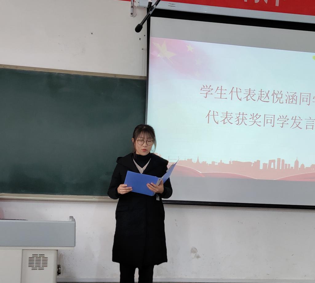 获奖学生代表获得者赵悦涵发表获奖感言,表达了对沁润泽环保科技有限公司与领导老师的感谢,也表示在以后的学习生活中,会再接再厉,继续努力奋斗。