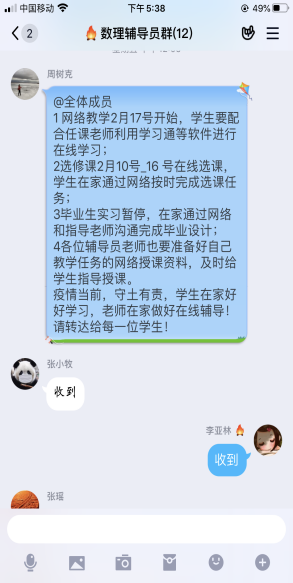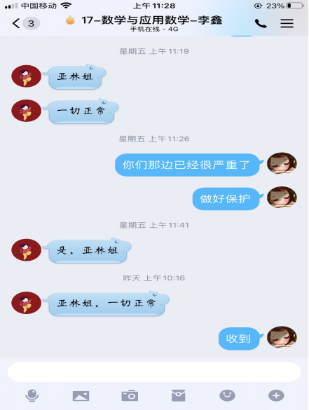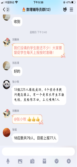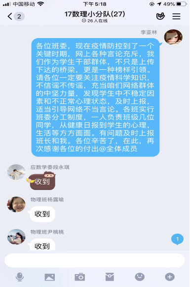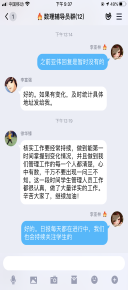 数理学院学工队伍心系学生,全员上阵。全方位多渠道做好疫情防控工作,快速反应并逐一摸排,第一时间了解并掌控学生身体状况和出行轨迹。辅导员们一方面通过电话,微信,扣扣,家长群等多种线上方式向学生传播疫情防控的科学知识,疏导疫情期间焦虑情绪,帮助学生树立战胜疫情的信心。另一方面,配合学校高效完成疫情防控情况日报,通过各种线上方式督促学生开展网上“报平安”,时刻关注学生动态。对身在重点疫区的学生,辅导员每日联系重点关注,了解学生身体心理状况,帮助学生解决实际需求。各年级充分发挥党员和学生干部的先锋模范作用,实行党员,班委负责制,采用人盯人全方位确保信息的准确性和真实性,为打赢防疫战和学生生命安全保驾护航。