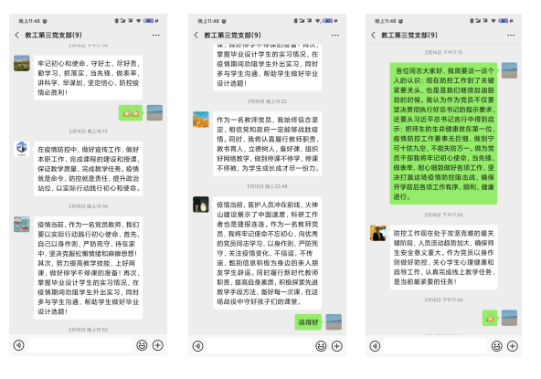 学院党总支书记王森同志要求党员同志要充分发挥先锋模范作用,勇于担当,主动作为,强调要守土有责,网络育人;立足岗位,争做先锋;不忘初心,奉献社会。他强调要争做防控知识的传播者,积极开展正面宣传引导,要做疫情谣言的制止者,不随意转发、不恶意评论、不信谣传谣,对违规行为坚决抵制;要带头做好师生疫情动态摸排和网络教学的准备工作,主动承担党组织分配的工作任务,立足本职工作,以主动担当的实际行动,践行共产党员的初心和使命。