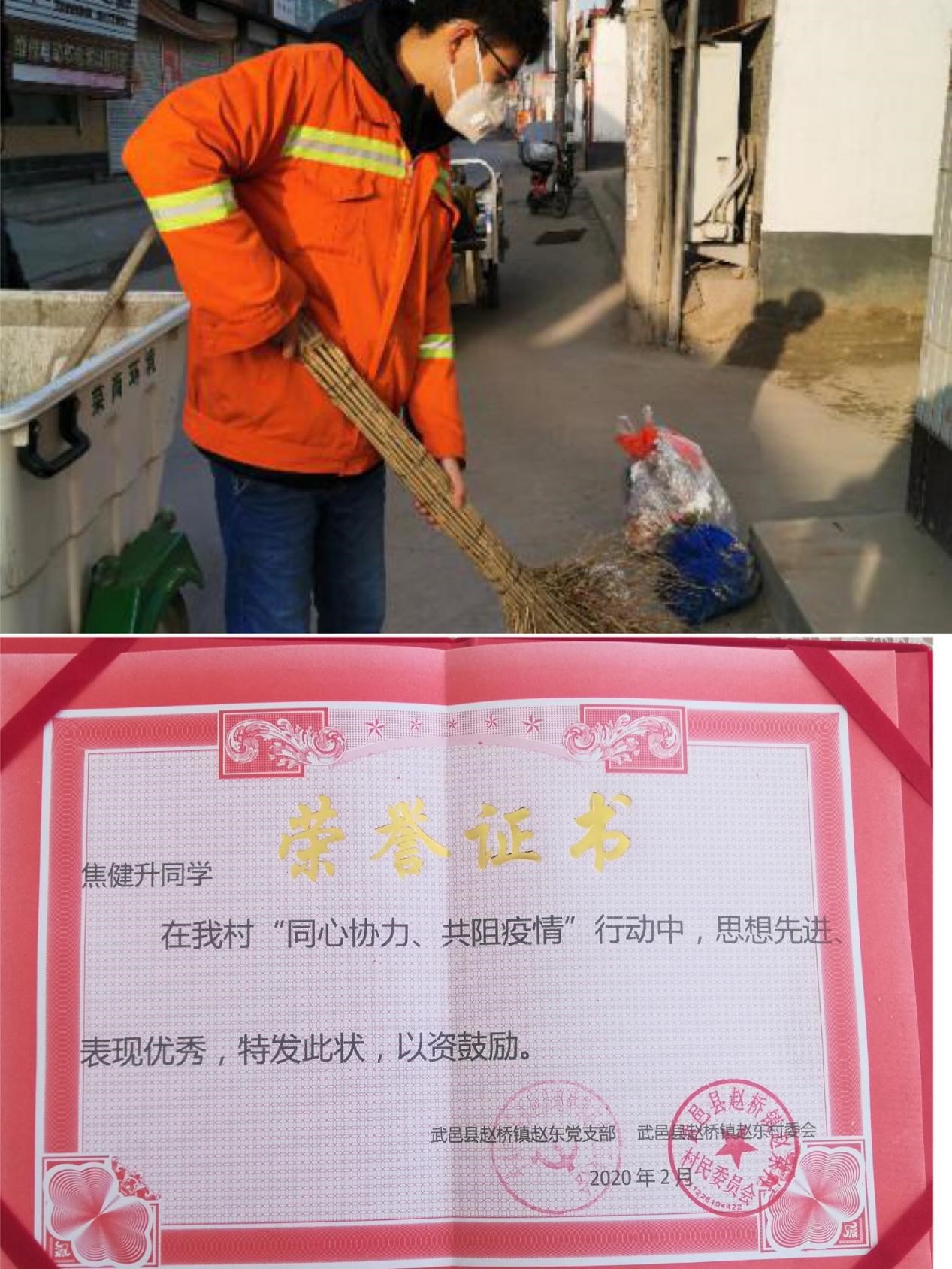 我院19级学生赵廉申,河南省平顶山市叶县叶邑镇人。作为村子里的一名大学生,他积极响应号召,参与了村里的疫情防控工作,每天工作10个小时,在志愿服务中,主要负责进出镇内的一个路口,对进出镇内的人员车辆进行检查,测量体温,做好登记工作,与此同时协助村干部做好疫情排查工作。 他说,疫情无情,人间有情。虽然工作任务繁重,但大家一起相互鼓励,都不觉得辛苦,明白自己现在在保卫养育自己的家乡。坚信在我们共同的努力下,我们迟早会打赢这场没有硝烟的战争,中国加油!武汉加油!只要我们团结起来,就能战胜一切困难!