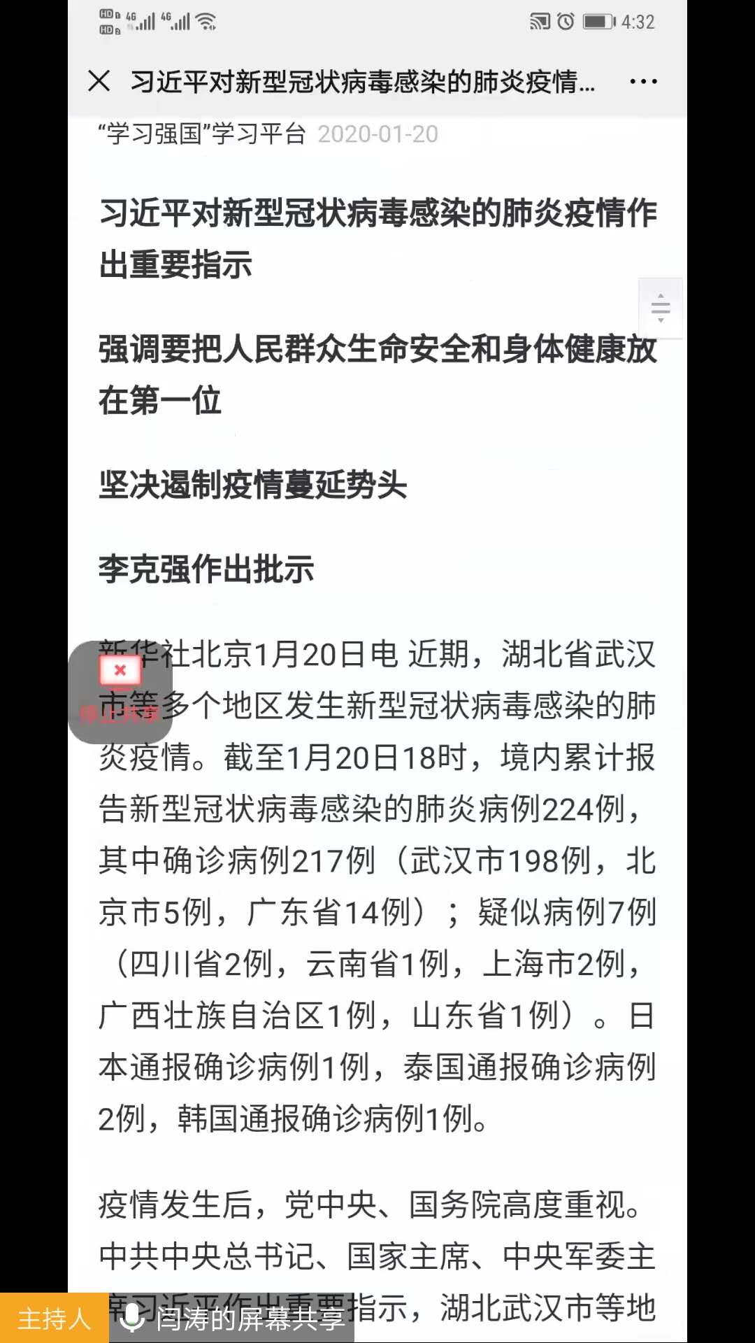 活动首先用“屏幕共享”的方式集体学习了习近平总书记对新型冠状病毒感染的肺炎疫情作出的重要指示精神、习近平总书记在北京市调研指导新冠肺炎疫情防控工作以及在中央政治局常务委员会会议上的重要讲话等学习资料。轮流发言时,同志们纷纷表示,习近平总书记的指示批示和重要讲话精神,深刻指出了当前疫情防控形势,对做好疫情防控工作作出重要部署,为做好下一步疫情防控工作指明了方向,传递出了党中央坚决把疫情扩散蔓延势头遏制住的坚定信心,必将凝聚起全党全军全国各族人民坚定信心、众志成城、同舟共济抗击疫情的磅礴伟力,为进一步做好疫情防控工作提供了精神动力和根本指导。同志们一致表示要切实把思想和行动统一到习近平总书记系列重要指示精神上来,进一步坚定必胜信心,保持清醒忧患,强化超常举措,以挺身而出、冲锋在前的战斗姿态,在疫情防控中履好职、尽好责、勇担当,努力为打赢疫情防控阻击战贡献力量。