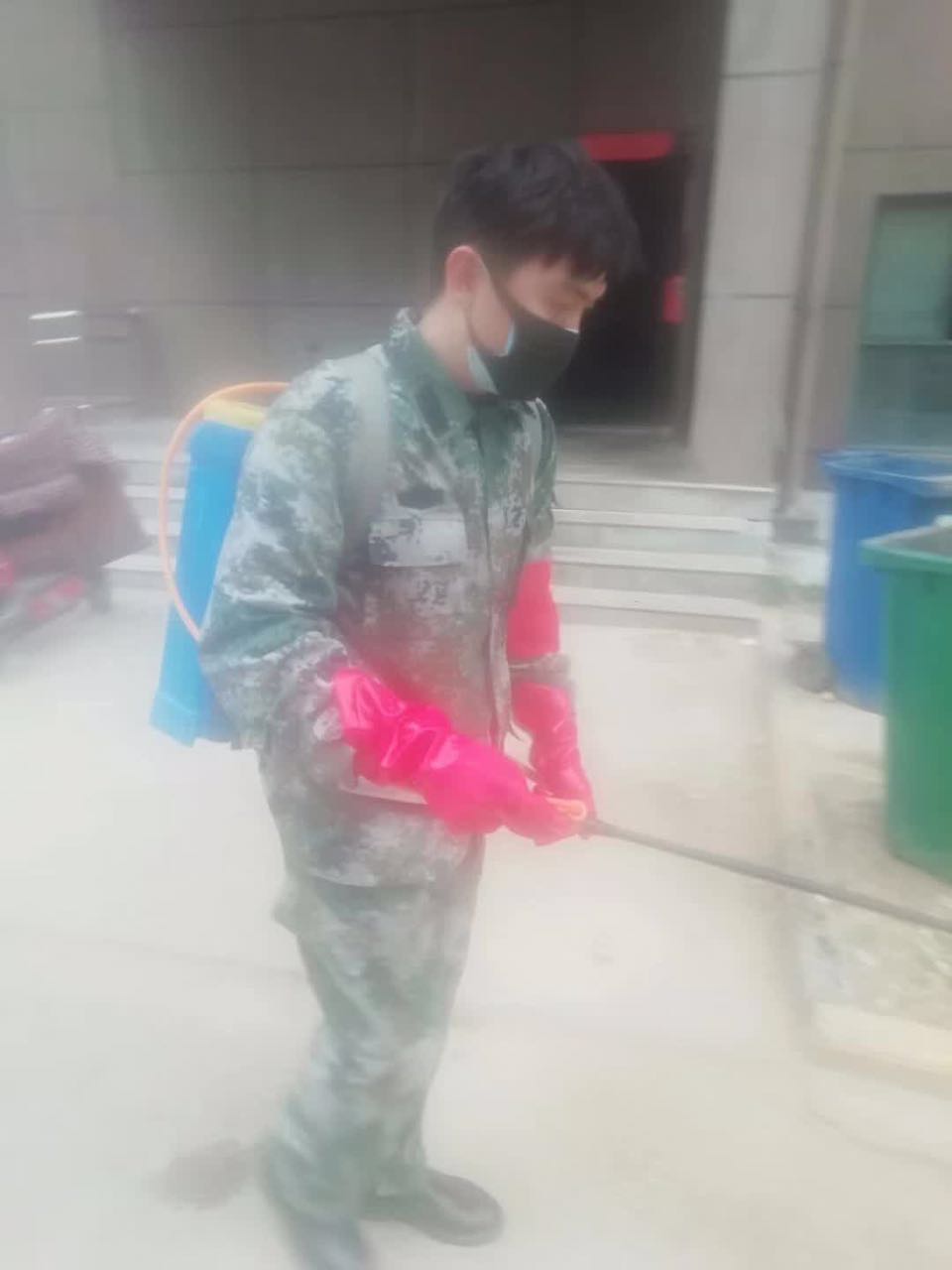 张炯同志准备出发喷洒消毒液