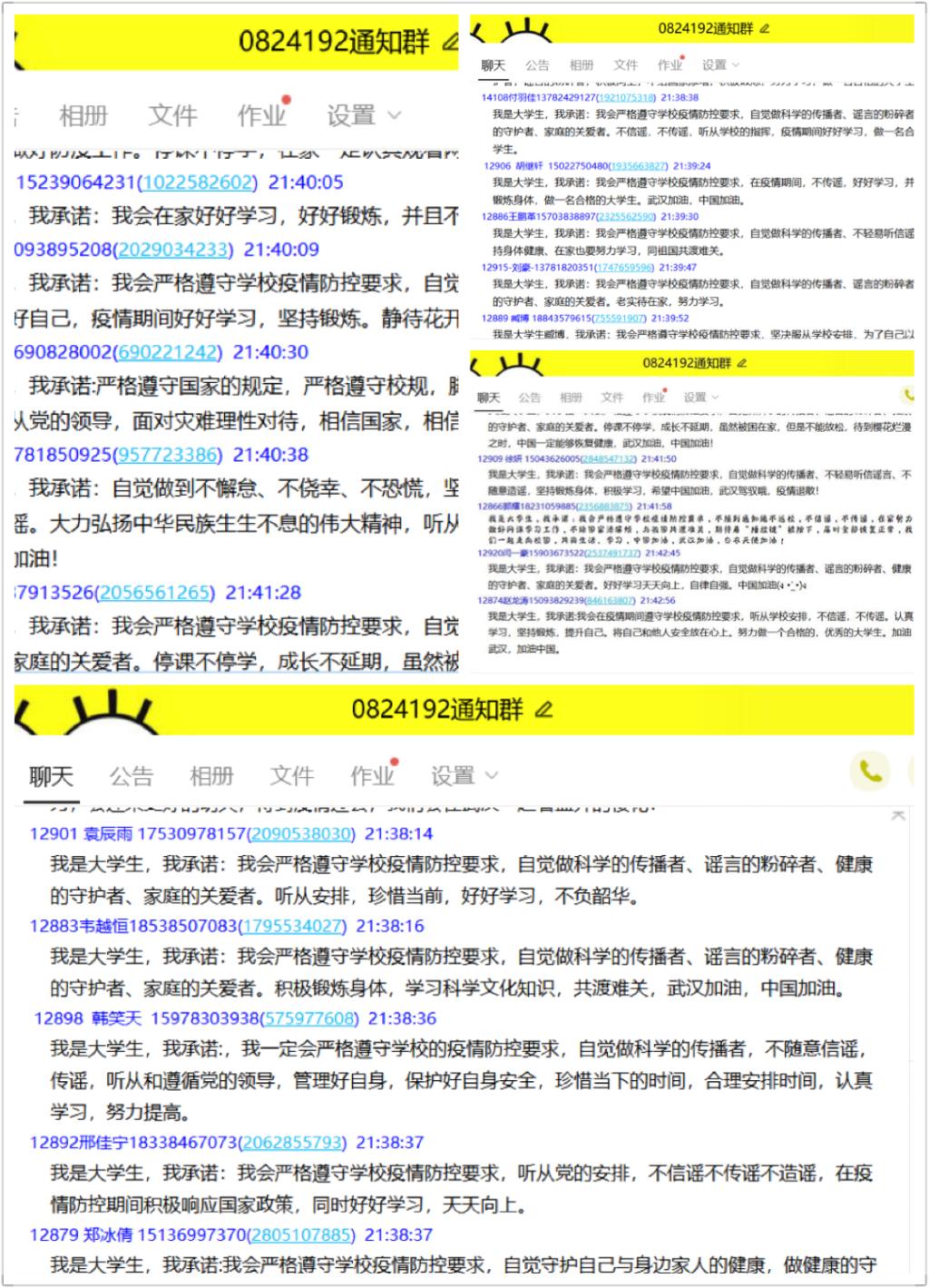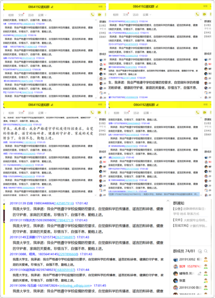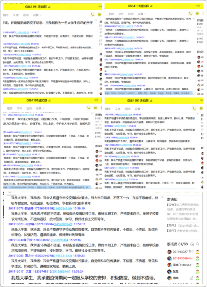 最后,班会在“一句话承诺”活动中结束。同学们纷纷发声,吐露自己心中的声音,一时间,班级群上热闹非凡,大家争先表示会严格遵守学校疫情防控要求,珍惜当下,勤勉上进。辅导员周岸送出寄语,期望大家做一个对社会、对国家、对人民有益的人,自强不息、乐观向上、奋发有为。