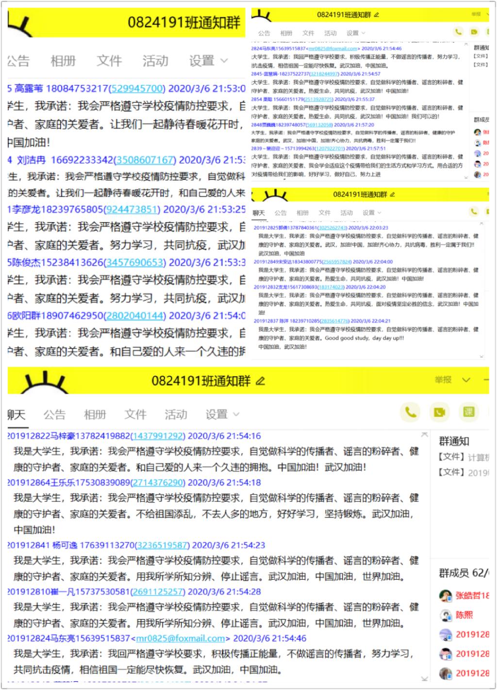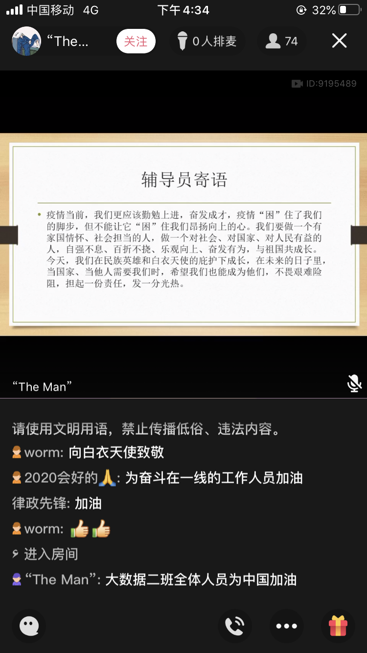 班会的第二个环节是学习身边的战“疫”课堂。在辅导员的带领下,同学们在线上观看了短片《白衣长城》,向奋战在一线的白衣天使致敬。接着,大家观看了班级自制的加油视频,再次为武汉加油,为祖国祝福。随后,辅导员列举身边的榜样事迹,引导大家要心中有榜样,向榜样看齐。辅导员周岸这样说:“最美逆行者阳世伟、党员胡凤瑞、毕业生党员边亚星、大学生志愿者李洋、积极分子张子轩、翟德道等等,他们在家乡一线当起了防疫志愿者,是我们身边的榜样。我们能做的也许不多,但管好自己,做好自己该做的,就是最好的贡献了。”同学们为这些身边的榜样事迹所打动,纷纷发言表示“无论何时当祖国需要我时,我定当挺身而出。”同学们积极活跃,班会气氛严肃而热烈。