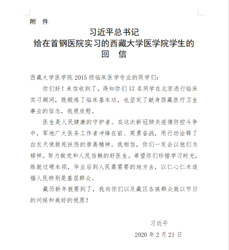 习近平总书记给在首钢医院实习的西藏大学医学院学生的回信内容