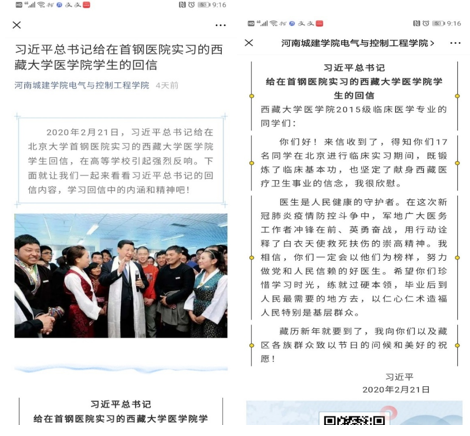 (通讯员 王丹阳 徐娟)2020年2月21日,习近平总书记给在北京大学首钢医院实习的西藏大学医学院学生回信,在高校引起强烈反响。电气学院党总支通过视频会议、网络平台宣传等方式组织全体师生学习了习近平总书记的回信内容。