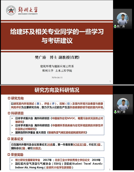 (通讯员 申媛媛 孙玲玲)为充分发挥我院优秀校友的榜样引领和典型示范作用,同时有针对性的为学生答疑解惑,帮助在校学生做好个人职业规划,实现顺利就业创业。能源与建筑环境工程学院(以下简称:能源学院)于4月11日晚19:30组织学院大一至大三学生通过腾讯会议参加此次线上交流分享会,会议由樊广涛博士主讲,学院党总支书记刘海燕、辅导员韩二帅、申媛媛和宋占科参加会议。