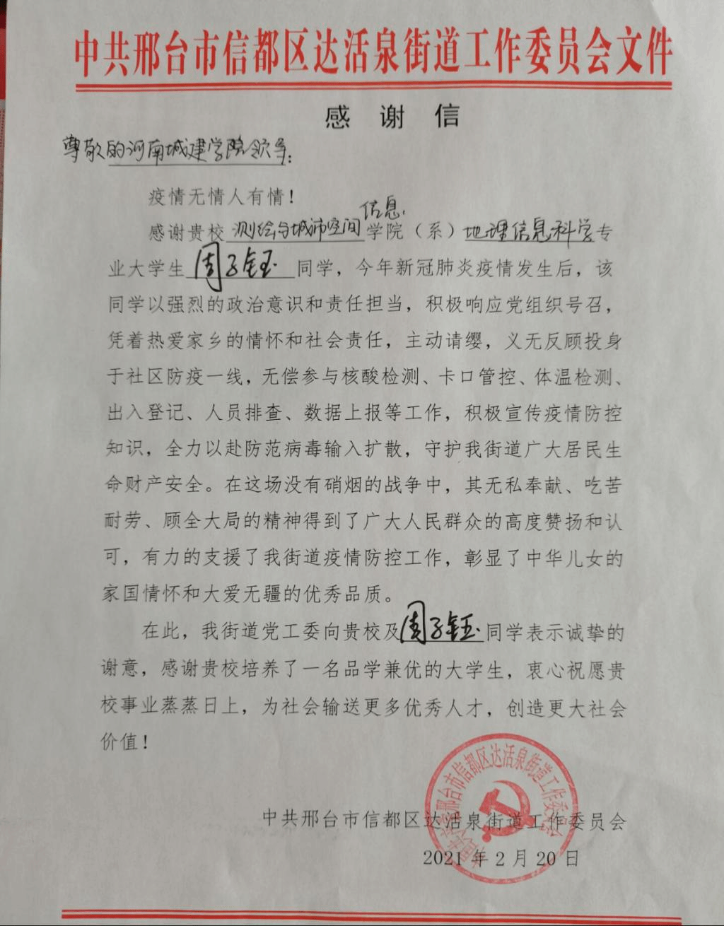 (通讯员 许东辉)近日,测绘与城市空间信息学院团学办收到一封来自河北省邢台市信都区达活泉街道工作委员会的一封感谢信,对我校测绘学院地理信息科学专业学生周子钰表达了诚挚的感谢,同时祝愿河南城建学院教育事业蒸蒸日上,为社会输送更多优秀人才,创造更大社会价值。