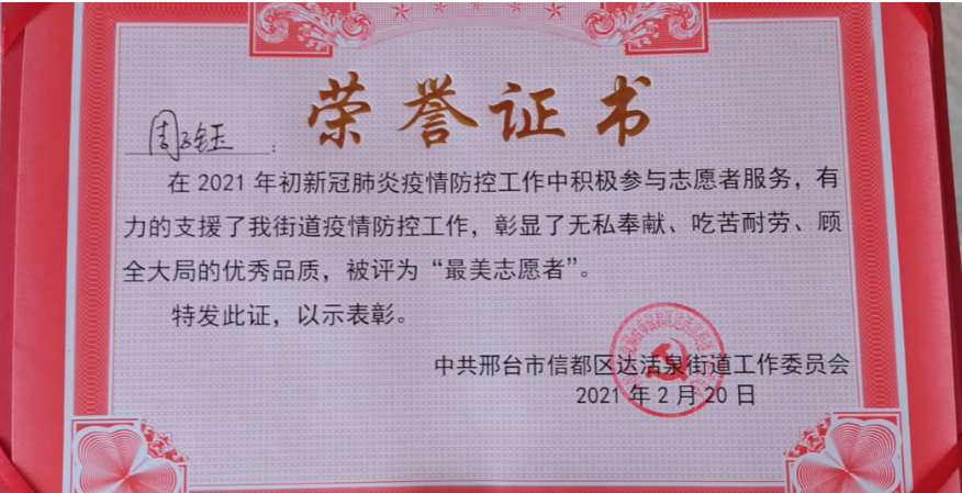 事情转回到2021年1月份,学校刚刚放假,此时全国多地突然出现多起聚集性新冠肺炎病例,其中河北邢台为较严重的地区之一,当时该市在一定范围内开始施行封闭管理,面对来势汹汹的疫情,很多热心青年并没有被吓倒,纷纷投入到这场抗疫斗争中,来自我校测绘学院的周子钰就是其中的一位。她此时才刚刚放学回家,没顾上休息第一时间来到了社区街道办事处要求以志愿者身份参加抗疫工作。