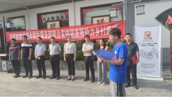 首先,由宝丰县李庄乡党委副书记(乡长)冯宇航致辞,他对河南城建学院师生的此次助农活动表示欢迎,对大学生的志愿精神表示肯定;他表达了政府领导对乡村振兴工作和巩固民众脱贫成果的高度重视;并对实体店直播平台对辖区农村特产提供的免费服务感到满意;更对此次助农活动寄予厚望。