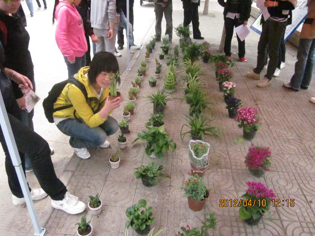 中午12时许,志愿者们将各种花卉以及宣传版面整齐的摆放在活动地点,并制作了介绍各种花卉作用、价值﹑习性以及栽培方法的标签,必要时还为参观者详细解说。随着放学铃声的敲响,驻足观赏的同学越来越多,活动现场鲜花争奇斗艳,花香郁馥,人声鼎沸,热闹非凡,展览活动也达到了高潮。