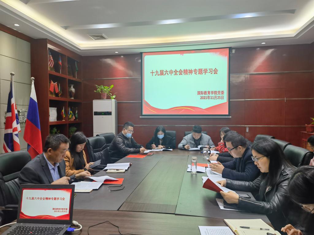 (通讯员:肖婧婧)11月25日下午,国际教育学院在和谐校区教学楼211室召开党委会扩大会议,专题学习党的十九届六中全会精神,安排部署全会精神在学院的学习宣传和贯彻落实工作。会议由党委书记吕鹏飞主持,学院党委班子成员、各支部党员代表、海外归国教师,全体教师党员参加会议。会上下发了《国际教育学院党委十九届六中全会及党的创新理论学习手册》。
