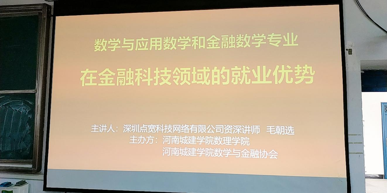 深圳点宽网络科技有限公司资深讲师毛朝选、严鉴知老师分别为我院师生做了Python基础知识与应用、量化策略基础知识与应用,以及“数学与应用数学和金融数学专业在金融科技领域的就业优势”的培训。数理学院数学与应用数学、金融数学专业学生及专业课教师参加了课程培训。后期,我院师生将在点宽网络公司老师的指导下,完成实训任务,并接受专业答辩。
