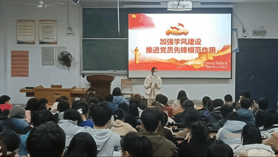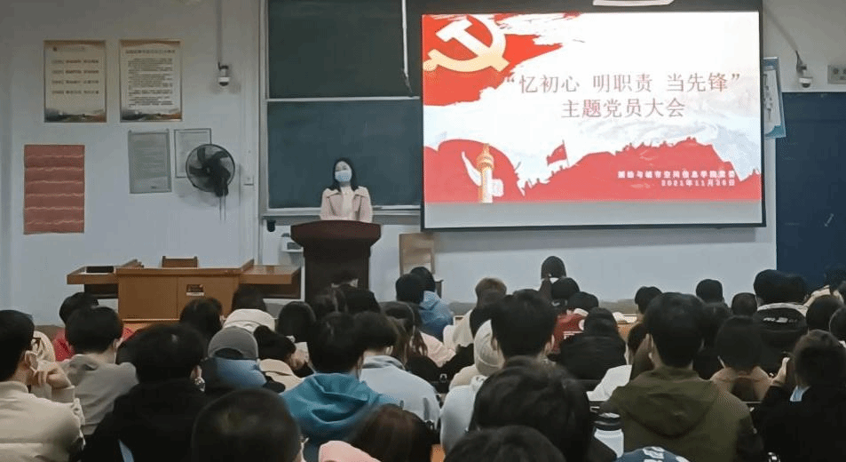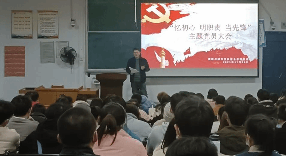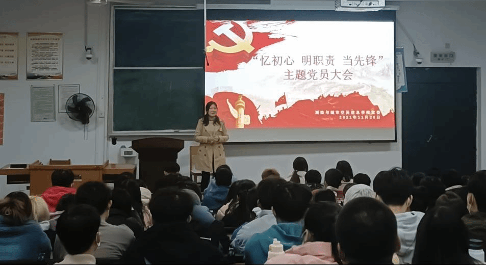 (通讯员:任昭荣 蒋永泰)为全面深入学习贯彻习近平总书记“七一”重要讲话精神和党的十九届六中全会精神,进一步提升党员同志的自身素养,充分发挥党员同志的先锋模范作用,测绘与城市空间信息学院于11月26日在5#C116召开“忆初心、明职责、当先锋”主题党员大会。党委副书记卫柳艳、党委组织员任昭荣、团学办副主任常莉、辅导员李丹、辅导员赵苗兴以及全体学生党员、2021下半年发展对象、院青马班成员参加此次大会。