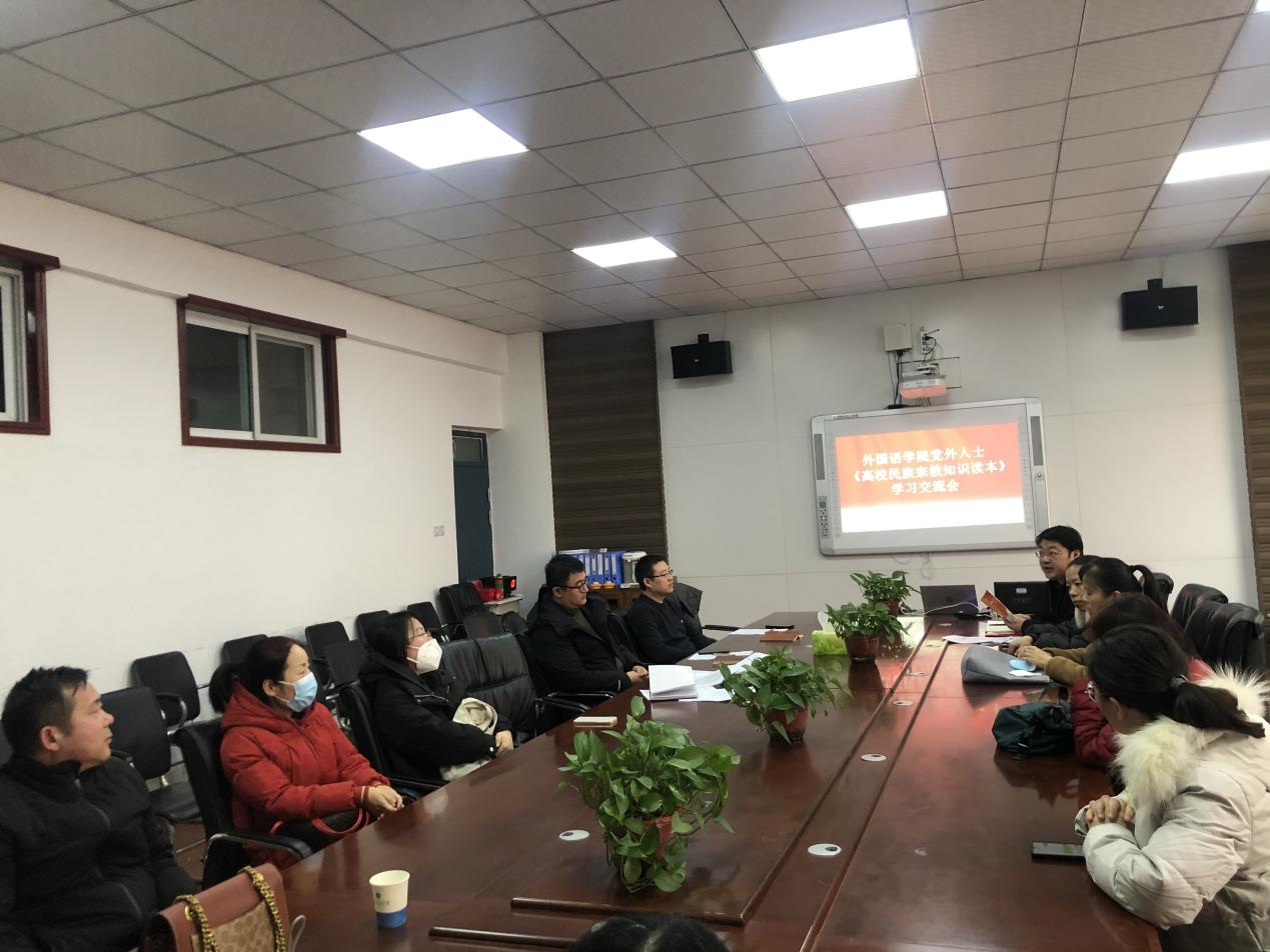 (通讯员秦小锋)12月28日下午,外国语学院在学院会议室召开党外人士学习交流会,集中学习《高校民族宗教工作知识读本》。外语学院统战委员、副院长秦小锋领学,副书记胡思博,民主党派人员、无党无派人员参加了学习交流会。学习交流会由党委书记王东旭主持。