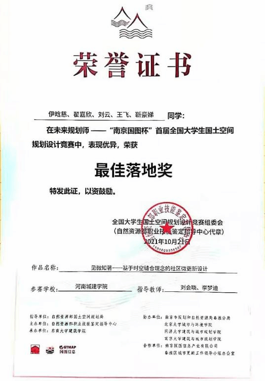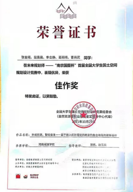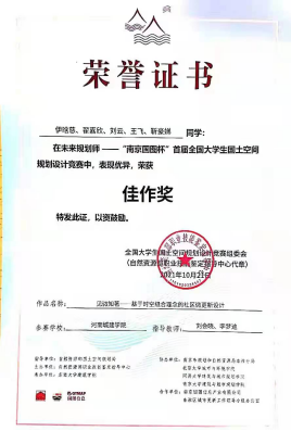 在自然资源部国土空间规划局的直接指导下,在东南大学、北京大学、同济大学、南京大学等部共建高校、南京市自然资源和规划局的通力协作下,自然资源部职业技能鉴定指导中心主办“未来规划师——‘南京国图杯’首届全国大学生国土空间规划设计竞赛”圆满完成,取得良好反响。我校建筑与城市规划学院城乡规划专业两支队伍参赛,获得一项最佳落地奖和两项佳作奖。