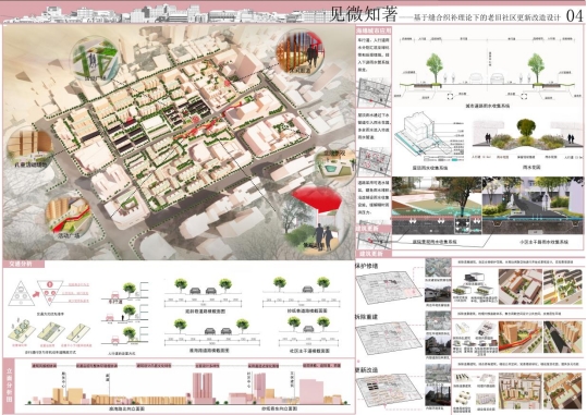 第一组作品题为:见微知著——基于时空缝合理念的社区微更新设计,由刘会晓、李梦迪老师指导,小组成员有:伊晗慈,翟嘉欣、刘云、王飞、靳豪娣,获得最佳落地奖和佳作奖。