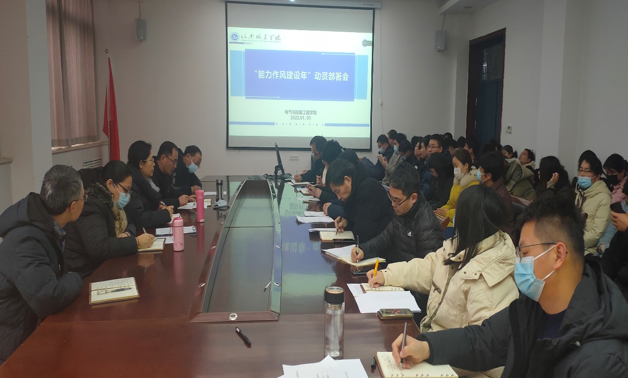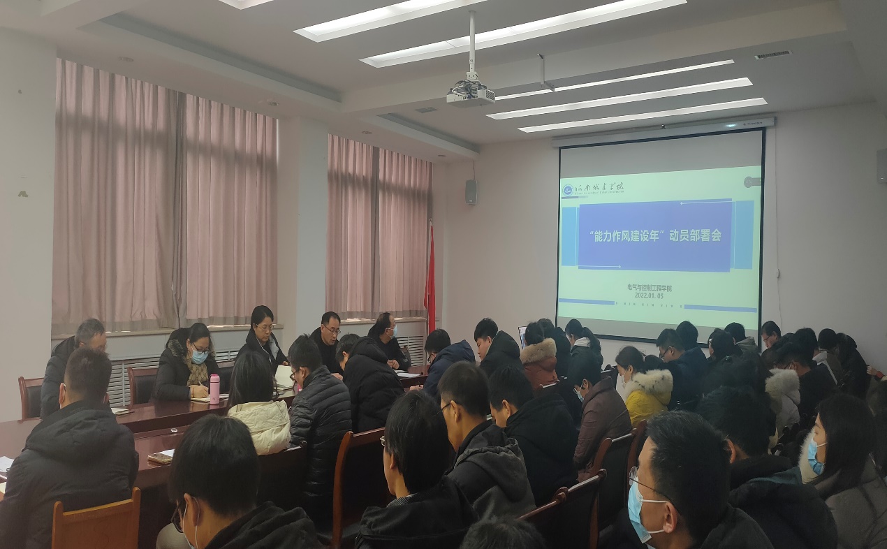 (通讯员 王旭红)1月5日下午,电气与控制工程学院在二号楼B313召开“能力作风建设年”动员部署会,学院党委书记杜留记作动员讲话,学院领导班子、全体教职工参加了会议。