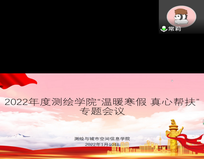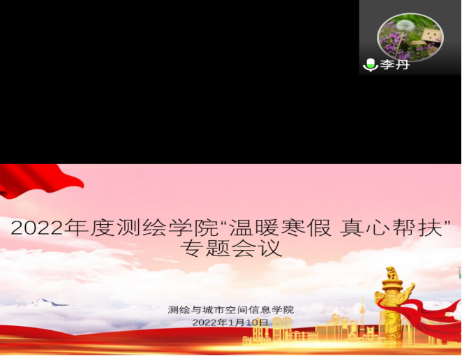 (通讯员:曾亚涛 何沛梓)寒假已至,温暖仍行。为进一步贯彻落实党和国家的资助政策,了解困难学生家庭现状,确保各项学生资助政策落实落细,让家庭经济困难学生度过一个温暖祥和的寒假,测绘与城市空间信息学院于1月10日上午举行了“温暖寒假 真情帮扶”专题线上会议,为即将开展的寒假温暖帮扶专项活动作出细致安排。团学办副主任常莉、辅导员李丹、李磊磊、李方圆、赵苗兴、郭军学及事务中心助理参加了此次会议。