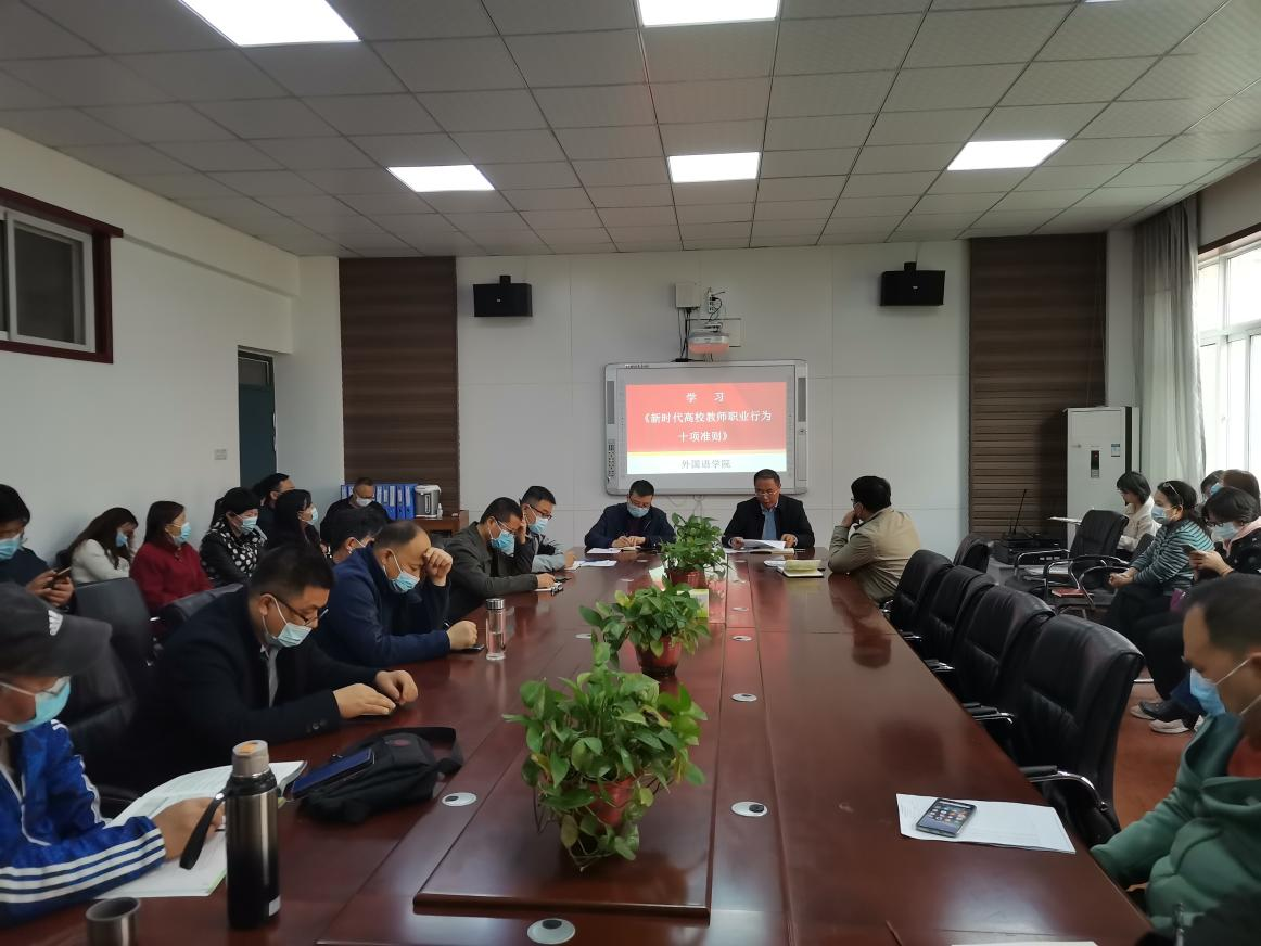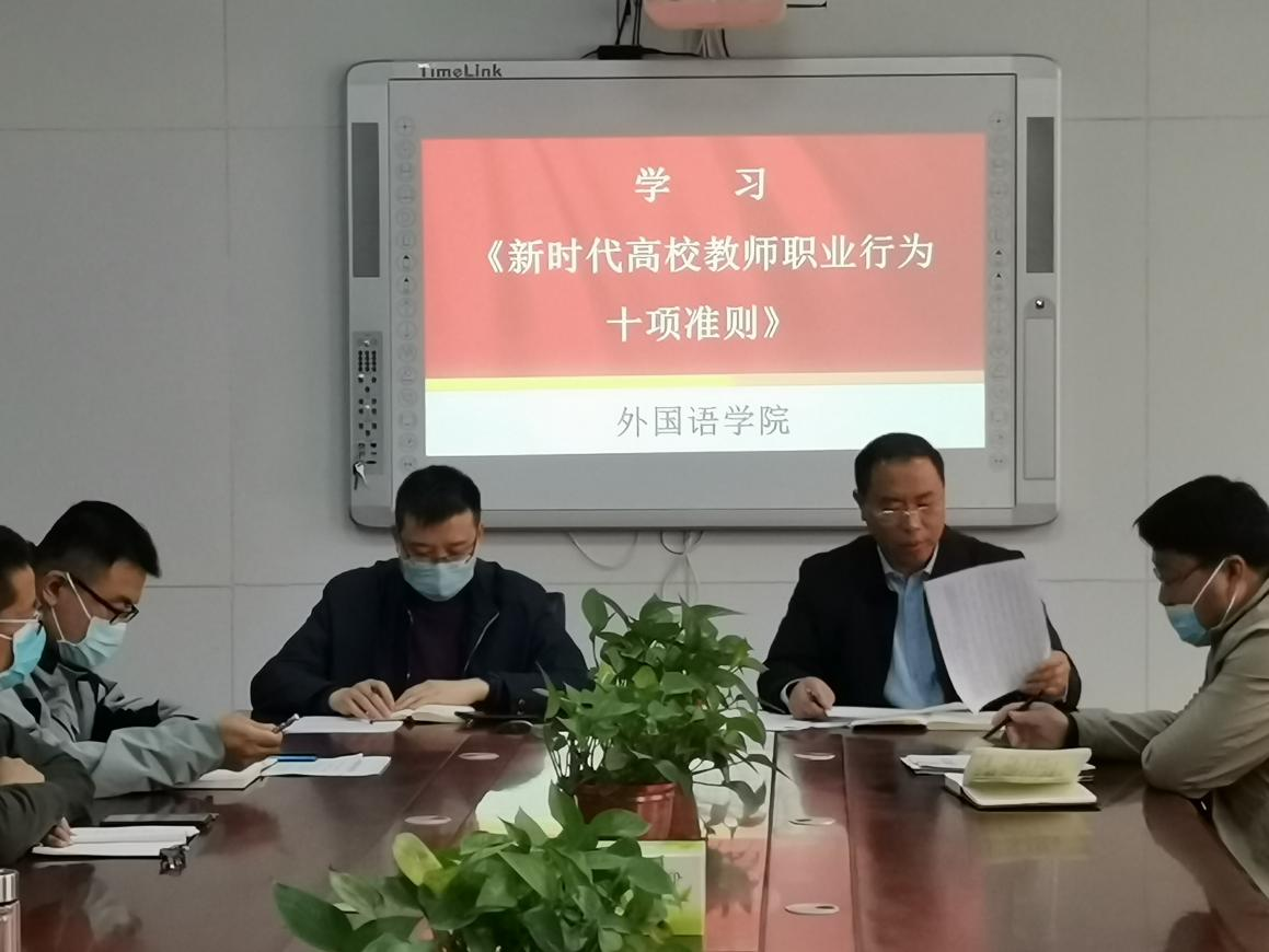 (通讯员 张湘雨)为进一步增强教师的责任感、使命感、荣誉感,规范职业行为,明确师德底线,引导广大教师努力成为有理想信念、有道德情操、有扎实学识、有仁爱之心的好老师,3月15日下午,外国语学院副院长张换成带领学院全体教职工于一号楼306会议室集中学习《新时代高校教师职业行为十项准则》。