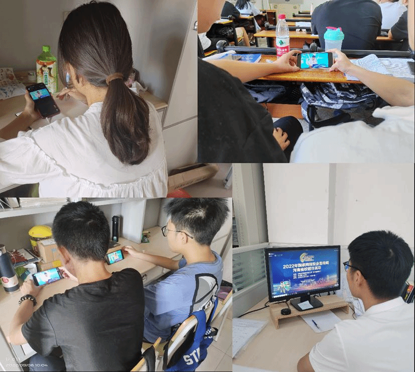 活动前期,我院围绕“网络安全为人民,网络安全靠人民”的主题,充分利用宣传栏、电子屏、微信公众号、QQ、制作展板等形式,开展宣传,加强对学生网络安全知识的宣传教育。9月5日活动开始,我院便组织全体学生通过关注“豫教思语”公众号参与网络安全知识竞赛,提高学生的网络安全技能。9月6日是网络安全教育周校园日,我院结合实际组织采用不同形式组织师生观看了“2022年国家网络安全宣传周河南省校园日活动”启动仪式的网络平台直播。