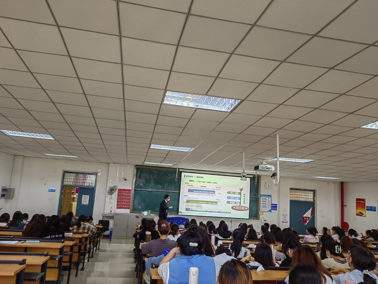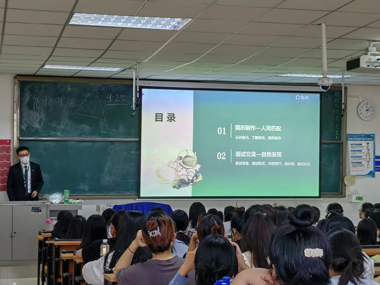 (张湘雨)9月21日下午,外国语学院邀请上海链家刘倩和徐家伟两位讲师于1#428教室为2023届毕业生举办简历制作与面试技巧公益讲座,外国语学院就业指导老师张湘雨和2023届全体毕业生参加。