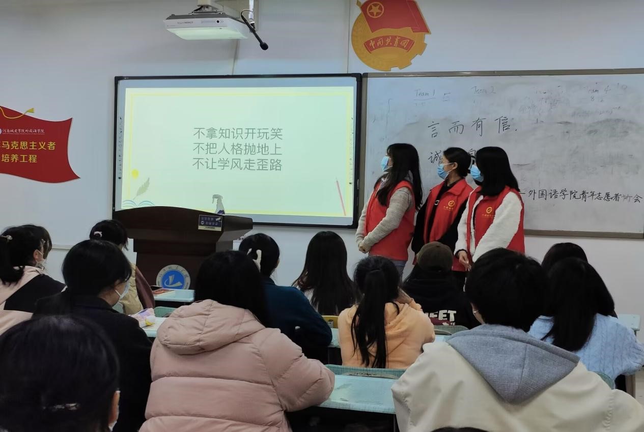 志愿者马滢滢、周嘉欣向大家阐释了有关诚信的内涵及相关内容,以此为同学们树立正确的的诚信观念;接着,通过教育短片介绍了当代大学生的诚信现状并解释了讲诚信的重要作用,这对营造我院未来良好的学风、考风具有重要意义;随后,志愿者们带领大家齐喊口号,呼吁同学们严格要求自己,培养诚信的人格。最后,考试临近,志愿者们鼓励大家严格遵守学校考风考纪、认真备考、诚信考试。