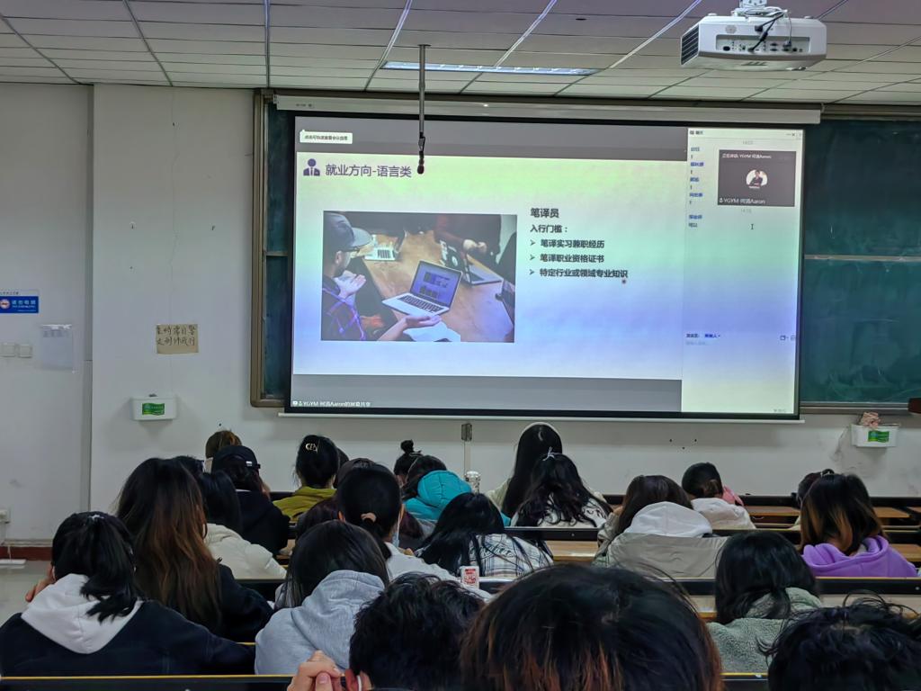 11月22日下午,外国语学院邀请译国译民翻译服务有限公司为学院学子做职业规划线上讲座,大一、大二年级学生分别集中于和谐校区1号楼328教室和326教室听取讲座。